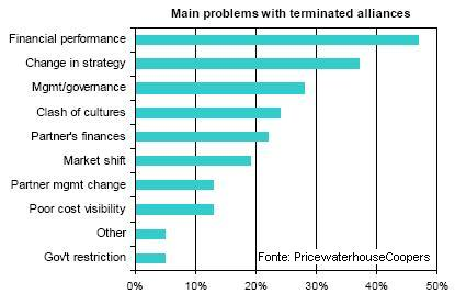 Apesar da compreensão e da utilização das alianças estar claramente a crescer, existem algumas dificuldades na concretização de alianças bem sucedidas. Mais de metade dos respondentes, ou não sabiam se as suas alianças estavam a cumprir os seus objectivos de desempenho, ou admitiram que o sucesso bafejou menos de 50 por cento dessas alianças. Quando lhes foi perguntada a razão do fracasso das alianças, os CFOs referiram causas como o desempenho financeiro, as alterações de estratégia, aspectos relacionados com a gestão/governância, conflitos de cultura, ou a saúde financeira do parceiro (ver gráfico).