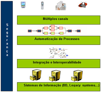 A modernização da administração pública (AP) pressupõe uma melhoria de processos internos e externos, de forma a que se possa efectuar uma gestão mais eficiente e rigorosa dos activos humanos, materiais e financeiros existentes, e das relações com os utentes do serviço. Nessa perspectiva torna-se fundamental que a solução a implementar seja baseada numa arquitectura do tipo daquela que é exemplificada na figura que se segue.
