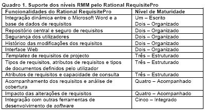 Até ao Nível Cinco, é teoricamente possível fazer manualmente tudo aquilo de que falámos neste artigo, ou através do recurso a ferramentas genéricas, como um processador de texto ou uma folha de cálculo. No entanto, a partir do Nível Dois, a utilização de uma ferramenta de gestão de requisitos poderá ajudar-nos a ser bastante mais eficientes e consistentes. O Quadro 1 mostra como é que as principais funcionalidades do Rational RequisitePro suportam as características chave dos cinco níveis de maturidade da gestão de requisitos.